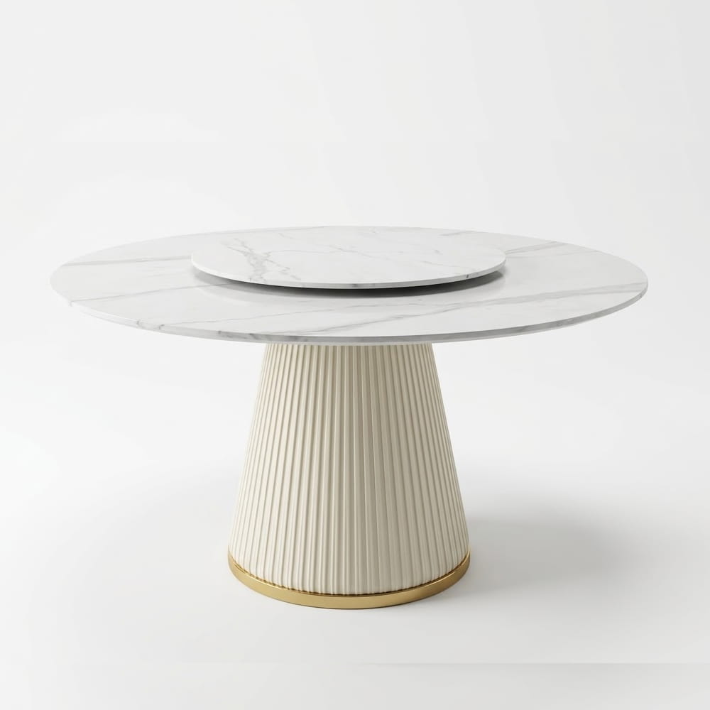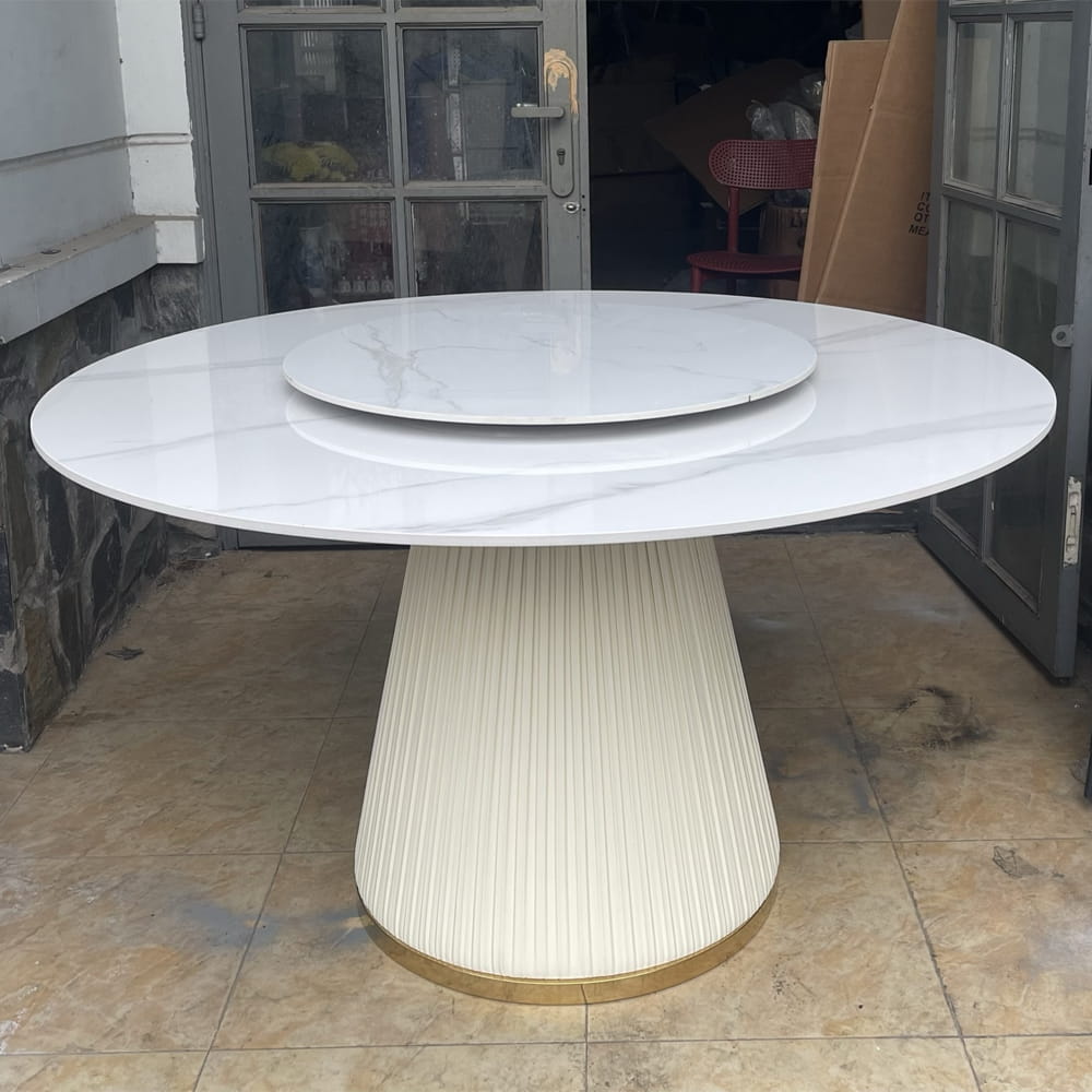 Cấu trúc 2 tầng xoay tiện lợi: Thiết kế gồm một mặt bàn lớn (Ø120cm) và một mặt xoay nhỏ (Ø70cm) phía trên. Cơ chế xoay mượt mà giúp việc bày trí và thưởng thức món ăn trở nên dễ dàng, tinh tế hơn trong các bữa tiệc gia đình.