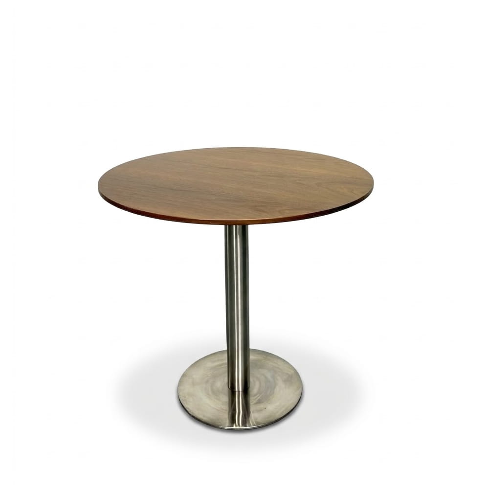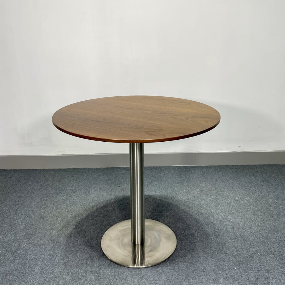 Chân bàn Inox: Hệ thống trụ đơn và đế mâm tròn được làm từ Inox cao cấp sáng bóng. Chất liệu này giúp sản phẩm chống gỉ sét tuyệt đối, bền bỉ trong môi trường máy lạnh hoặc nơi có độ ẩm cao.